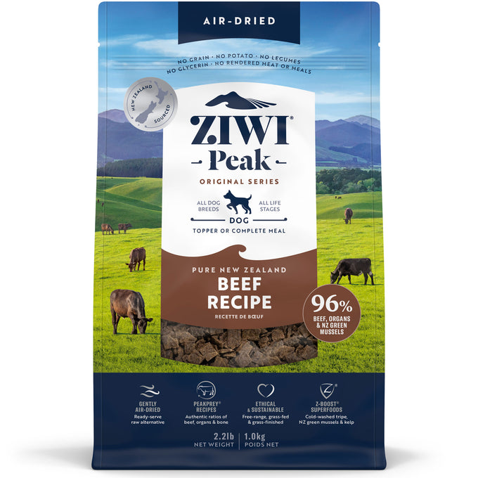 "Raw without the thaw". ZiwiPeak provides the benefits of feeding raw with the convenience of kibble. The beef and lamb are grass-fed outdoors year round and provide many added advantages such as higher omegas, less fat and more natural vitamins. All ZiwiPeak products contain New Zealand Green Lipped Mussel, a proven source of glucosamine, chondroitin, glycogens, Omega 3 and Omega 6 fatty acids, which nutritionally support long-term joint health. Their unique air-drying process gently removes moisture, minimizing damage to proteins, vitamins, sensitive nutrients and enzymes and produces a jerky-like consistency that dogs love.