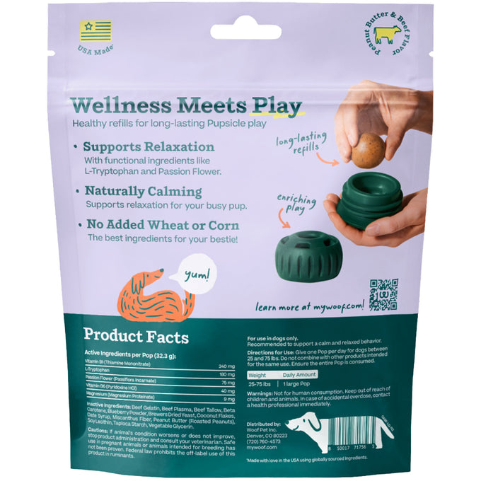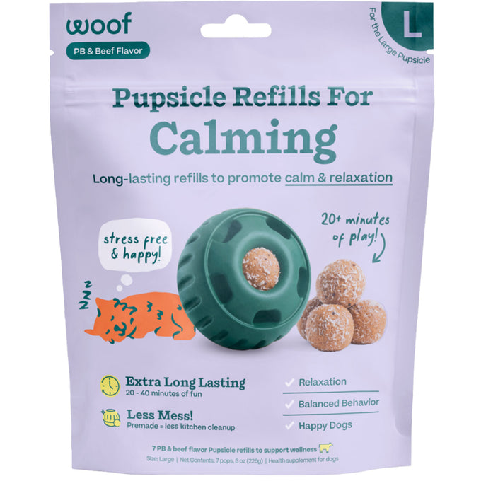Help your pup relax and unwind with Woof Pupsicle Refill Pops – Calm. Made in the USA with all-natural calming ingredients, these dog treat refills fit the Woof Pupsicle toy for safe, soothing chewing, mental enrichment, and anxiety relief.