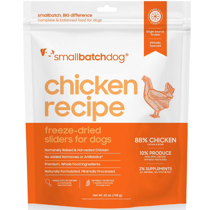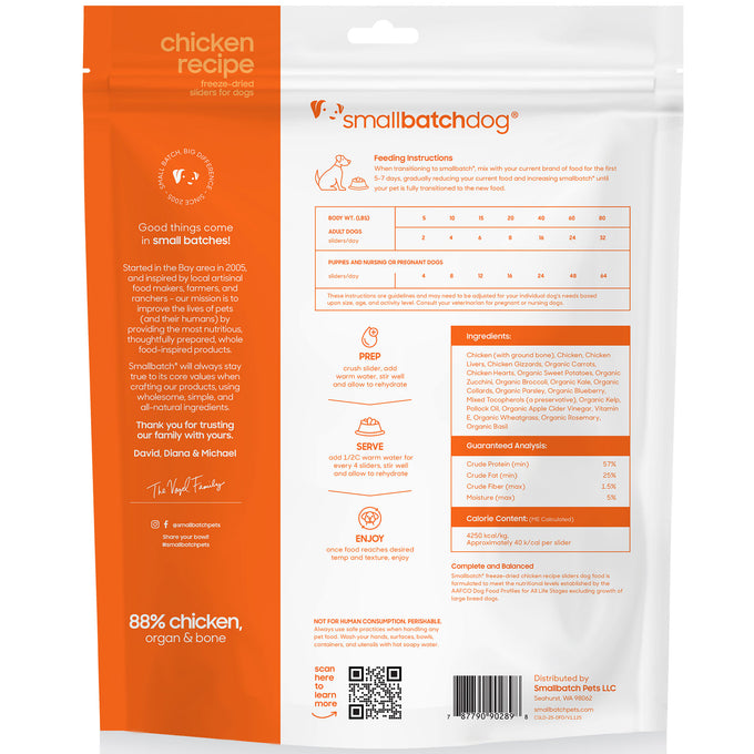 The goal at Smallbatch is to produce the freshest pet food that mimics the animal’s natural eating habits.  Their focus is to be the best at what they do – providing a local, healthy, and earth conscious alternative that the consumer can trust with as small a footprint as possible.  Their single source protein formulas are sourced locally and are “made to order” to ensure freshness.  The Sliders are 88% meat (including muscle meat, organs and bone), 10% produce and 2% supplements.  The product isn’t produced until they receive the order from the distributor.