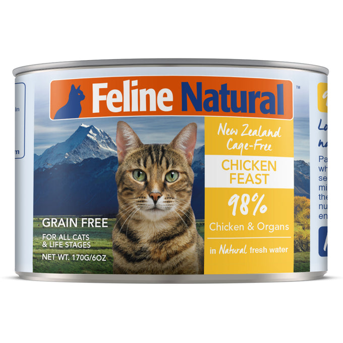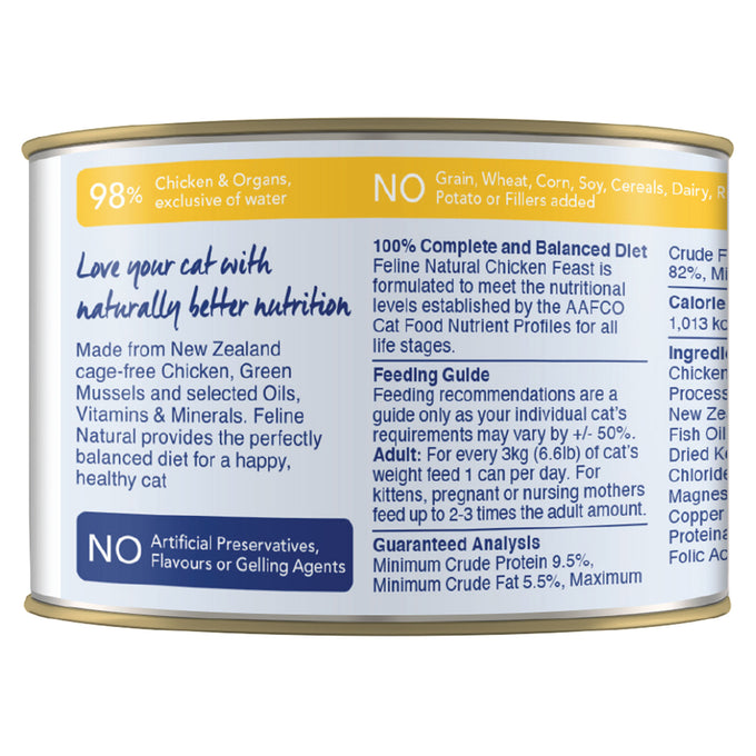Packed with New Zealand wholefood ingredients and select vitamins and minerals, Feline Natural's Canned Chicken Feast Cat Food comes in a convenient, ready-to-use can.