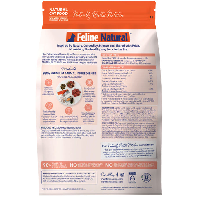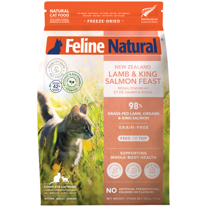 Nourish your cat with the best of land and sea. Feline Natural's premium freeze-dried recipe features 98% grass-fed, free-range lamb and organs, paired with sustainably caught King salmon. Enriched with green-lipped mussels, taurine, and essential vitamins and minerals, it supports whole-body health.
