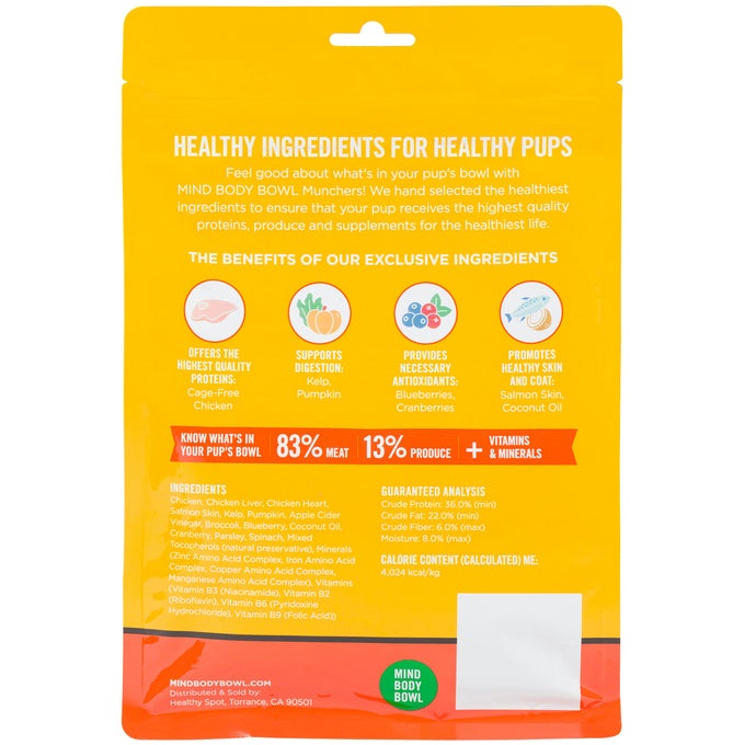 Feel good about what's in your pup's bowl with MIND BODY BOWL Munchers! We hand selected the healthiest ingredients to ensure that your pup receives the highest quality proteins, produce and supplements for the healthiest life.
