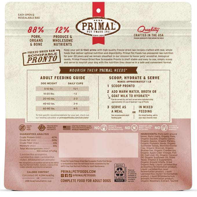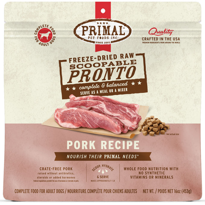 Primal Freeze-Dried Raw Pronto Dog Food makes it easy to serve your pup a raw diet! It provides all of the benefits of a raw diet in a shelf-stable, convenient format. All you have to do is serve, hydrate, and give to your dog to enjoy!