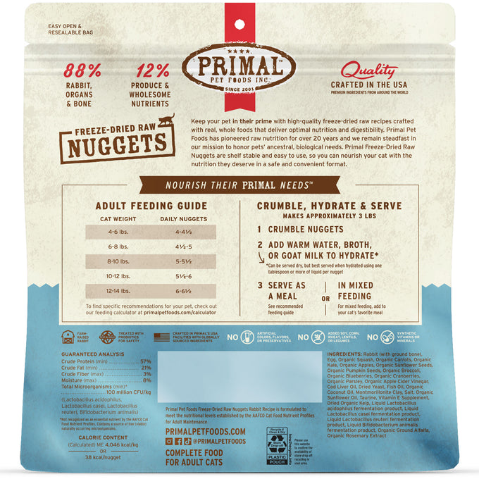 Primal Pet Foods was founded with the goal of improving the quality of life and overall health and happiness of pets through wholesome foods that mimic the diet of animals in the wild. Their meats and poultry are human-grade, vegetarian fed, all-natural with no steroids, no added hormones and no antibiotics. All Primal formulas offer a nutrient-dense form of highly digestible amino acids, animal-based essential fatty acids, and vitamins and minerals derived from whole food sources. To rehydrate, break nuggets into small pieces and mix thoroughly with water.