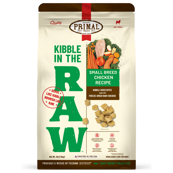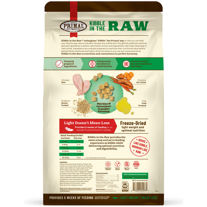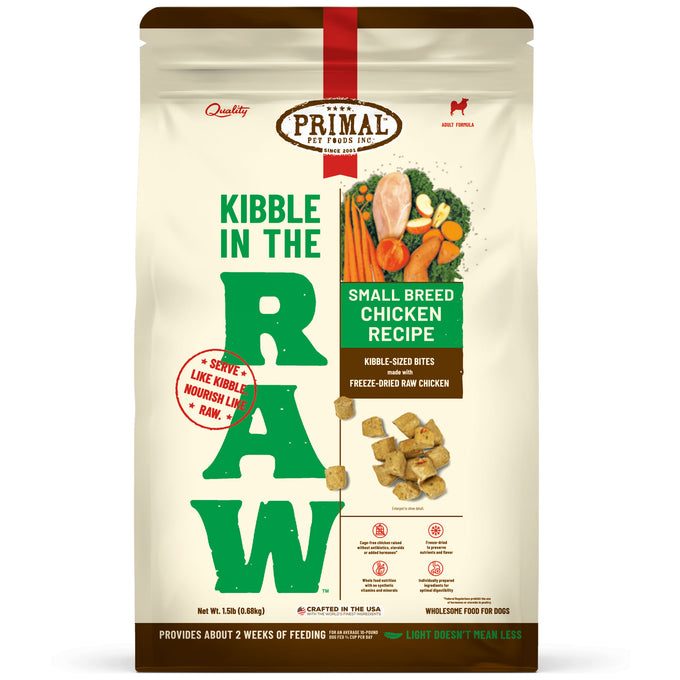 Achieve the ideal blend of nutrition and convenience with Primal's Kibble in the Raw! Kibble in the Raw reimagines "kibble" using a Primal approach, enabling you to provide your dog with nutrition the way nature intended. Designed to provide nourishment akin to raw feeding, Kibble in the Raw features responsibly sourced, premium raw freeze-dried protein, air-dried USDA Organic fruits and vegetables, gently steamed sorghum, and cold-pressed oils.