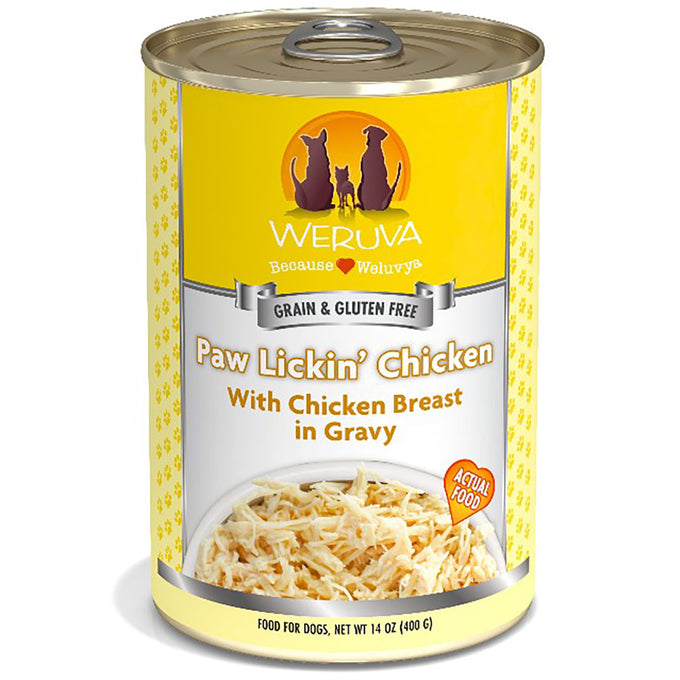 Hold everything except the chicken (and the gravy)! Made with boneless, skinless, white breast meat, Weruva's Paw Lickin' Chicken dog food is free of added antibiotics, free of added hormones and cage free. Developed with the carnivore diet in mind, this recipe combines high-quality meats and proteins, healthy fats, minimal carbohydrates, and high moisture content for tasty, nutritious dishes canines love.