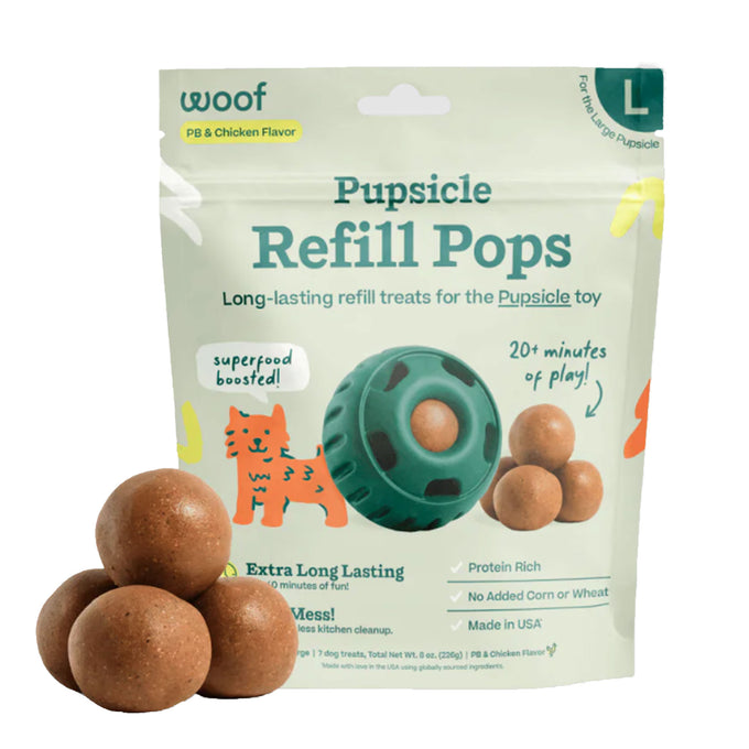 Treat your pup to something they'll drool over with Woof Pupsicle Refill Pops. Made in small-batches in the USA with all-natural ingredients, crafted to perfectly fit the Woof Pupsicle for hours of safe, satisfying enrichment.
