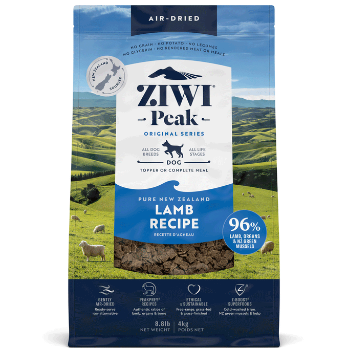 "Raw without the thaw". ZiwiPeak provides the benefits of feeding raw with the convenience of kibble. The beef and lamb are grass-fed outdoors year round and provide many added advantages such as higher omegas, less fat and more natural vitamins. All ZiwiPeak products contain New Zealand Green Lipped Mussel, a proven source of glucosamine, chondroitin, glycogens, Omega 3 and Omega 6 fatty acids, which nutritionally support long-term joint health. Their unique air-drying process gently removes moisture, minimizing damage to proteins, vitamins, sensitive nutrients and enzymes and produces a jerky-like consistency that dogs love.